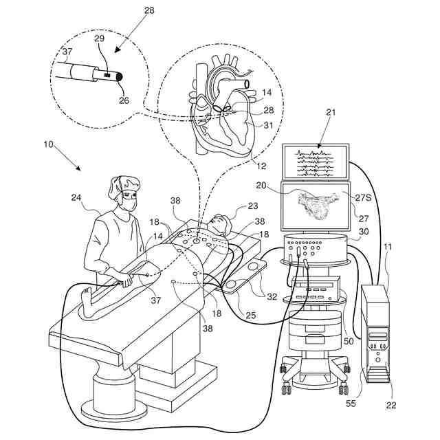 ここで、本開示の一例による、カテーテルベースの電気生理学的マッピング及びアブレーションシステム10を示す、図1を参照する。システム10は、医師24によって、患者の血管系を通して心臓12の血管構造体内又は腔31などの腔内へと経皮的に挿入される、複数のカテーテルを含む。典型的には、送達シースカテーテル37は、心臓12の所望の位置付近の左心房又は右心房内に挿入される。その後、複数のカテーテルを送達シースカテーテルに挿入して、所望の位置に到達させることができる。複数のカテーテルは、心内電位図(IEGM)信号の感知専用のカテーテル、マッピングのカテーテル、アブレーション専用のカテーテル、並びに/又は感知及びアブレーションの両方に専用のカテーテルを含んでもよい。本明細書には、IEGM信号及びマッピングを検知するように構成されている例示的なカテーテル14が示されている。