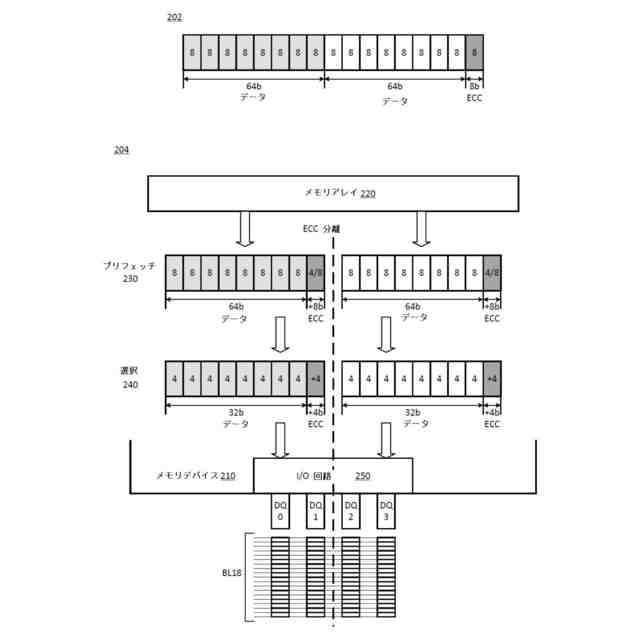 【解決手段】内部ECC(エラー検査訂正)を実行するメモリデバイスは、Nビットチャネルを、ECCの適用のために2つのN/2ビットチャネルとして処理する。N/2チャネルのためのECCは、NビットのためのECCより簡易であり、従って、各N/2ビット部分は、2つのN/2ビット部分として処理される場合に個別に訂正可能である。メモリデバイスは、2つのサブチャネルとするチャネルに対するECCの適用のための追加のハードウェアを含む。例えば、メモリデバイスは、Nビットチャネルの2つのサブチャネルに対するECCの適用を可能にする内部ECCのためのECCビットを格納するべく追加サブアレイと、適用される場合に追加サブアレイにアクセスするための追加ドライバと、を含む。