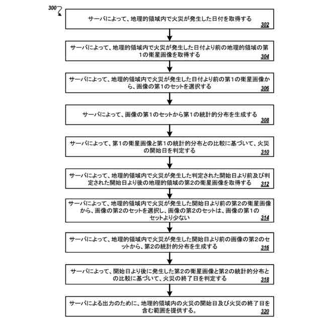 【解決手段】 いくつかの実装形態では、サーバは、領域内で火災が発生した日付を取得する。サーバは、火災が発生した日付より前のその領域の衛星画像を取得する。サーバは、衛星画像から第1の統計的分布を生成する。サーバは、第1の統計的分布を使用して火災の開始日を判定する。サーバは、開始日より前及び開始日より後のその領域の第2の衛星画像を取得する。サーバは、開始日より前の第2の衛星画像から、画像の第2のセットを選択する。サーバは、画像の第2のセットから第2の統計的分布を生成する。サーバは、第2の統計的分布を使用して火災の終了日を判定する。サーバは、出力のために開始日及び終了日を提供する。