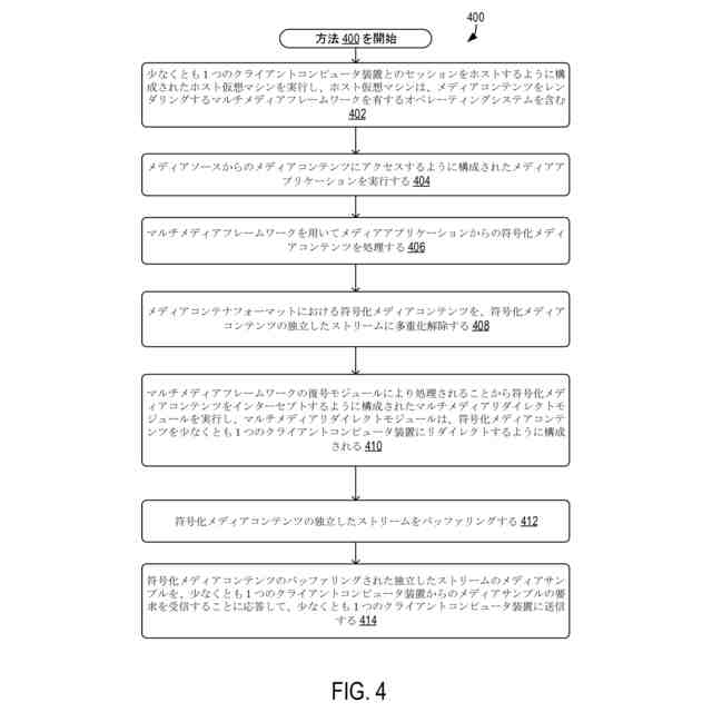 プロセッサが、少なくとも1つのクライアントコンピュータ装置とのセッションをホストするように構成されたホスト仮想マシンを実行するステップであり、前記ホスト仮想マシンは、メディアコンテンツを復号およびレンダリングするマルチメディアフレームワークを有するオペレーティングシステムを含む、ステップと、