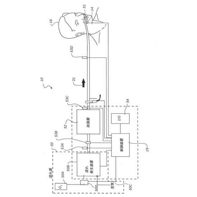 別の態様において、本発明は、患者にガス流を提供する流れ発生装置であって、ガス流が酸素分画を備える、流れ発生装置と、患者の鼻及び/又は口における酸素分画に関連する入力を受信し、患者の鼻及び/又は口における酸素分画に基づいてガス流の流量を調整するように構成された制御装置とを備える呼吸システムを備えると言われていてもよい。