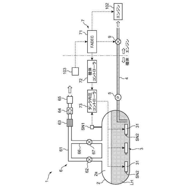 図2は、燃料供給システム1の概略構成を示すシステム図である。本図に示される燃料供給システム1は、燃料としての水素をエンジン102に供給するシステムであって、機体101の内部に設置されている。燃料供給システム1は、燃料タンク2と、昇圧機構3と、燃料供給配管4と、ポンプ5と、圧力制限機構6と、コントローラ7とを備える。