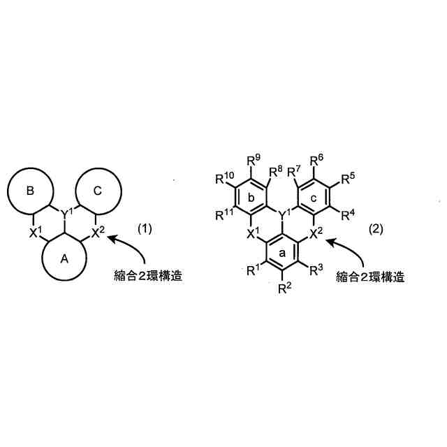 構成される上記式(1)中央の縮合2環構造と結合を共有する5員環または6員環を有し