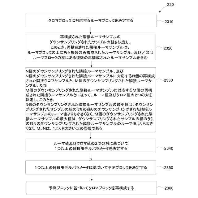 【解決手段】ルーマ値及びクロマ値の2つの対は、N個の再構成された近傍ルーマサンプル及びN個の再構成された近傍ルーマサンプルに対応するN個の再構成された近傍クロマサンプルと、M個の再構成された近傍ルーマサンプル及びM個の再構成された近傍ルーマサンプルに対応するM個の再構成された近傍クロマサンプルとに従って決定される。N個の再構成された近傍ルーマサンプルの最小値は、再構成された近傍ルーマサンプルの組のうちの残りの再構成された近傍ルーマサンプルのルーマ値以上である。M個の再構成された近傍ルーマサンプルの最大値は、再構成された近傍ルーマサンプルの組のうちの残りの再構成された近傍ルーマサンプルのルーマ値以下である。M、Nは正の整数であり、1よりも大きい。1つ以上の線形モデルパラメータはルーマ値及びクロマ値の2つの対に基づいて決定され、予測ブロックは1つ以上の線形モデルパラメータに基づいて決定される。