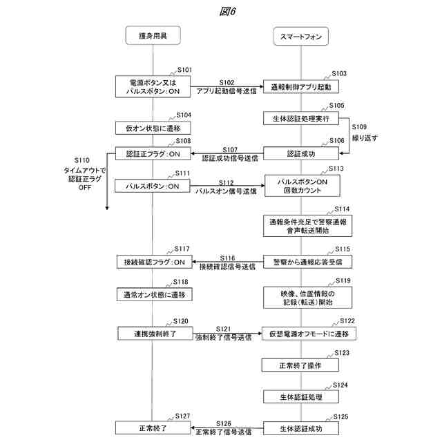 前記護身用具との通信接続を終了する操作を受け付けると、前記生体認証処理を実行し、生体認証が成功すると前記護身用具に対して正常終了信号を送信し、
