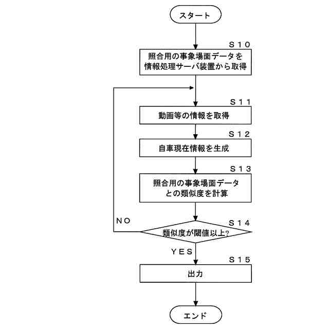 【解決手段】車両の周囲状況を示す自車両周囲情報に少なくとも基づいた現在の自車現在情報を取得し(S11)、交通の事象に遭遇した事象遭遇車両の複数について、当該事象に遭遇した所定時間前における当該事象遭遇車両の周囲状況を示す事象遭遇車両周囲情報に少なくとも基づく複数の事象遭遇前情報を取得し(S10)、複数の事象遭遇前情報中に自車現在情報に対して予め設定された類似の基準を満たす情報が存在する際に、車両の出力手段を動作させる(S12からS14)。