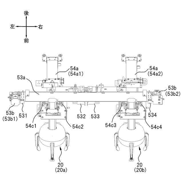 第1右端作動部532を左側へ移動させ第2左端作動部533を右側へ移動させた状態を示す図である。