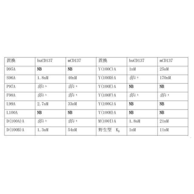 態様では、ヒトCD137に対する抗CD137抗体のアフィニティは、マウスCD137に対するmAb10のアフィニティよりも少なくとも2倍(例えば少なくとも3、4、5、6、7、8、9または10倍)高い。一部の態様では、抗CD137抗体のアフィニティは、500、450、400、350、300、250、200、250、200、175、150、125、110または100nM以下である。一部の態様では、ヒトCD137に対する抗CD137抗体のアフィニティは、マウスCD137に対するmAb10のアフィニティ