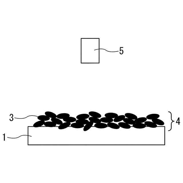 上記工程により、敷粉塗布層を有するセラミックス成形体を用意する。次に、セラミックス成形体の表面方向からレーザ顕微鏡を用いてセラミックス成形体上の敷粉塗布層の体積を測定する第1測定工程を行う。図2に、第1測定工程の一例を示した。図中、符号1はセラミックス成形体、符号3は敷粉、符号4は敷粉塗布層、符号5はレーザ顕微鏡、である。