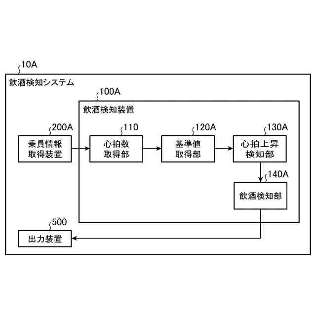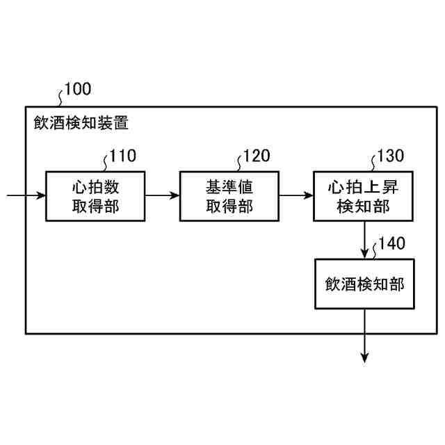 【解決手段】飲酒検知装置(100)は、被験者の現在の心拍数を取得する心拍数取得部(110)と、被験者の心拍数の基準値である基準心拍数を取得する基準値取得部(120)と、現在の心拍数および基準心拍数を用いて、心拍数の上昇率を算出する心拍上昇検知部(130)と、現在の心拍数、基準心拍数、および、心拍数の上昇率、を用いて被験者の飲酒状態の度合いを示す飲酒スコアを出力する飲酒検知部(140)と、を備えた。