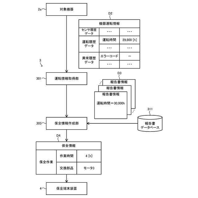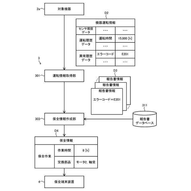 【解決手段】情報処理装置3は、対象機器2aが運転されることで記録された機器運転情報D2を取得する運転情報取得部301と、運転情報取得部301により取得された機器運転情報D2に基づいて、対象機器と同一又は類似の機能を有する機器2にて過去に発生した事象を記録した報告書情報D3が登録された報告書データベース311を参照し、対象機器2aの保全に関する保全情報D4を作成する保全情報作成部303とを備える。