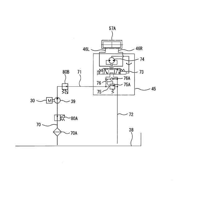 請求項4記載の発明は、前記ポンプ(39)と操舵装置(45)を接続する第1配管(71)の間に第1電磁弁(80B)を設け、前記電動機(30)が駆動している場合には、前記第1電磁弁(80B)を介してポンプ(39)と操舵装置(45)を連通し、前記電動機(30)の駆動が停止している場合には、前記第1電磁弁(80B)を介してポンプ(39)と操舵装置(45)の連通を遮断する請求項1記載の作業車両である。