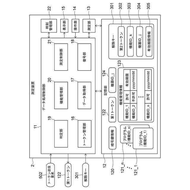 【解決手段】測定装置2は、第1トークン122をランダムに生成し、記憶部12に記憶するトークン管理部16と、制限の解除が許可された機能の機能識別情報303と、第2トークン302とを少なくとも含み、所定の暗号化方式に基づいて暗号化された解除キー301を取得するデータ取得部17と、解除キー301を暗号鍵情報120に基づいて復号する復号部18と、復号された解除キー301に含まれる第2トークン302が第1トークン122と一致するか否かを判定する判定部19と、第2トークン302が第1トークン122と一致すると判定された場合に、解除キー301に含まれる機能識別情報303によって特定される機能の制限を解除する。