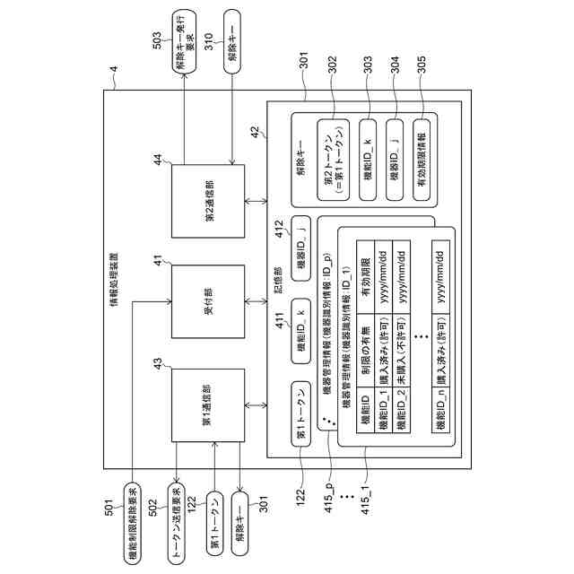 前記機能を識別するための情報である機能識別情報のうち制限の解除が許可された前記機能の機能識別情報と、前記認証に関する情報である第2トークンとを少なくとも含み、前記所定の暗号化方式に基づいて暗号化された解除キーを取得するデータ取得部と、