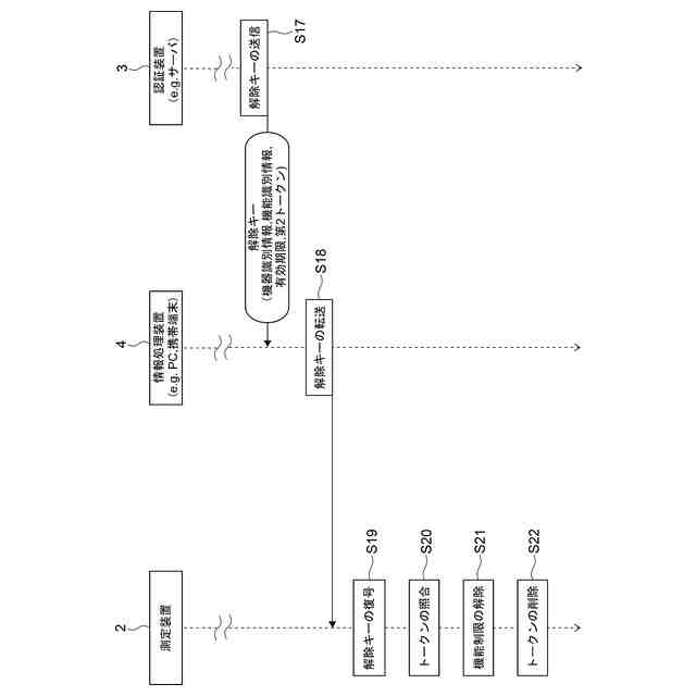 機器を識別するための情報である機器識別情報のうち前記機能の制限の解除対象である前記測定装置の前記機器識別情報と、前記機能ごとに付与され前記機能を識別するための情報である機能識別情報のうち制限の解除対象である前記機能の前記機能識別情報と、前記第1通信部によって受信した前記トークンとを記憶する記憶部と、