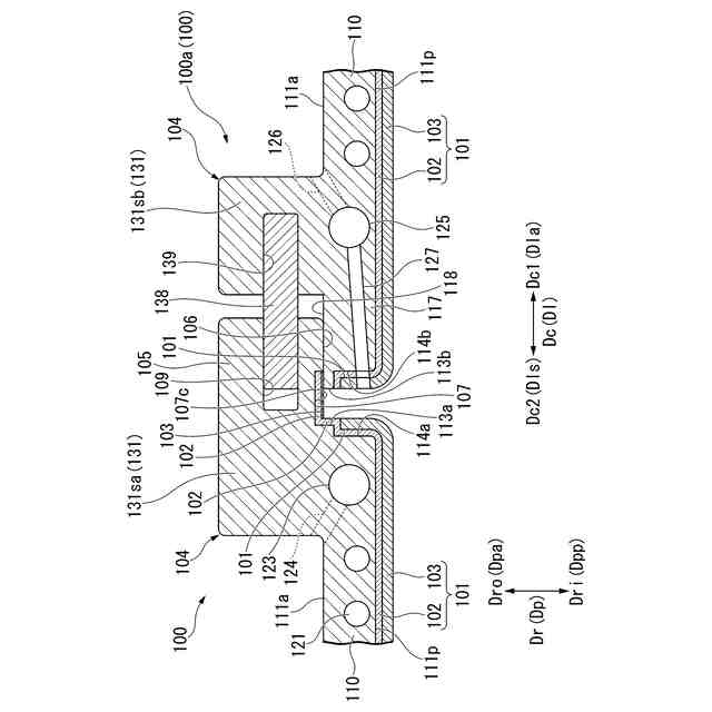 前記オーバラップ部は、前記径方向における径方向内側と径方向外側とのうちの前記径方向外側を向き、前記突出流路側面よりも前記径方向内側に位置するオーバラップ反流路側面と、前記周方向第二側を向き、前記オーバラップ反流路側面の前記周方向第二側の端から前記径方向内側に向かって広がる第二本体側面と、前記周方向第二側を向き、前記第二本体側面よりも前記周方向第一側に位置する第二層形成側面と、を有し、前記第二層形成側面における前記径方向内側の端が前記本体流路側面の前記周方向第二側の端に接続され、