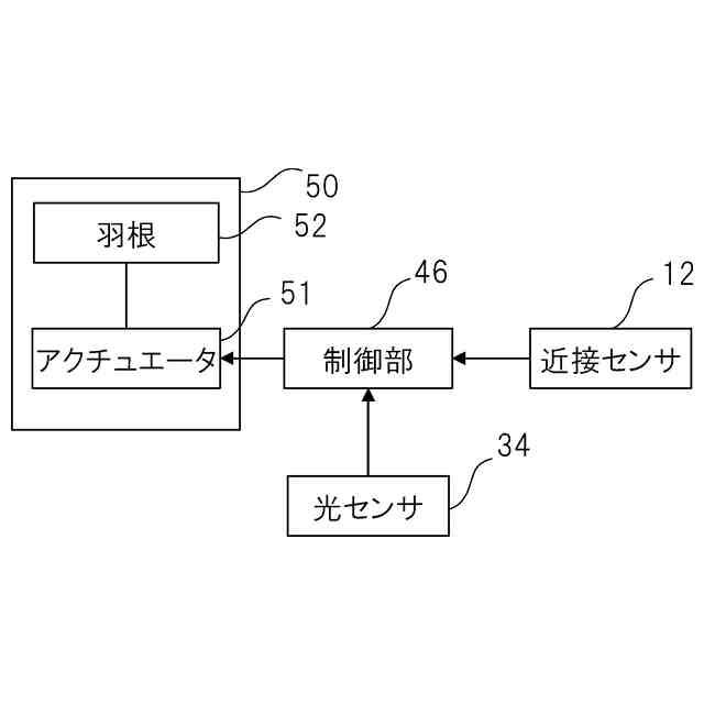 前記近接センサにより前記第1物体が検出された場合、前記駆動部は、前記羽根を前記第1位置から前記第2位置に位置させる、