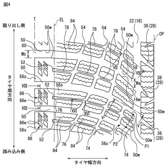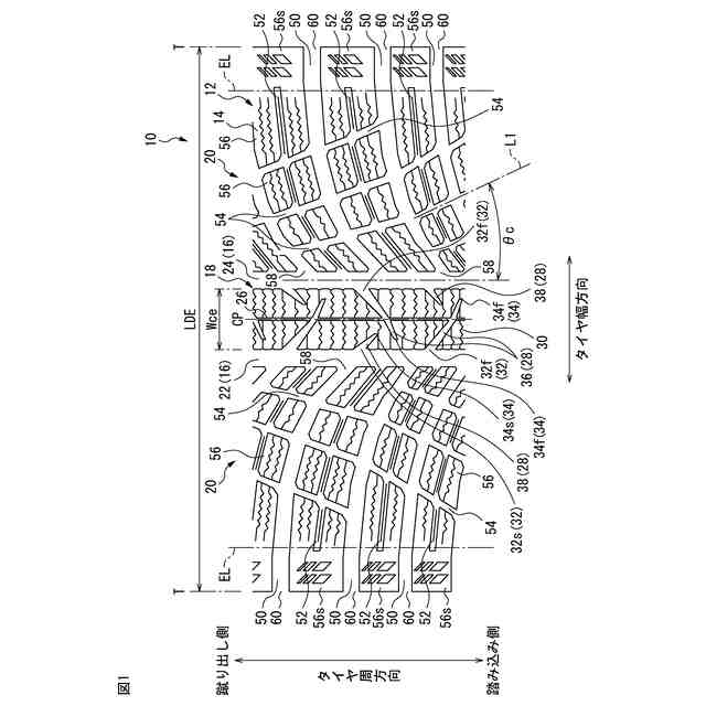 【解決手段】タイヤ10は、周方向主溝16と、少なくとも2本の周方向主溝16によって区画形成された内側陸部18と、内側陸部18に対しタイヤ幅方向外側にそれぞれ配置された外側陸部20と、を備える。外側陸部20に、傾斜溝50と、傾斜細溝52と、逆傾斜溝54と、が配置されている。傾斜溝50は、周方向主溝16からタイヤ幅方向外側に向かって延在し、踏み込み側から蹴り出し側へ傾斜しており、トレッド端Tに接続された先端60を有する。傾斜細溝52は、周方向主溝16からタイヤ幅方向外側に向かって延在し、踏み込み側から蹴り出し側へ傾斜し、外側陸部20内に配置された先端76を有する。逆傾斜溝54は、蹴り出し側から踏み込み側に向かって延在し、タイヤ幅方向内側から外側へ傾斜している。傾斜細溝52の溝幅W2は、傾斜溝50の溝幅W1の20%以上80%以下である。