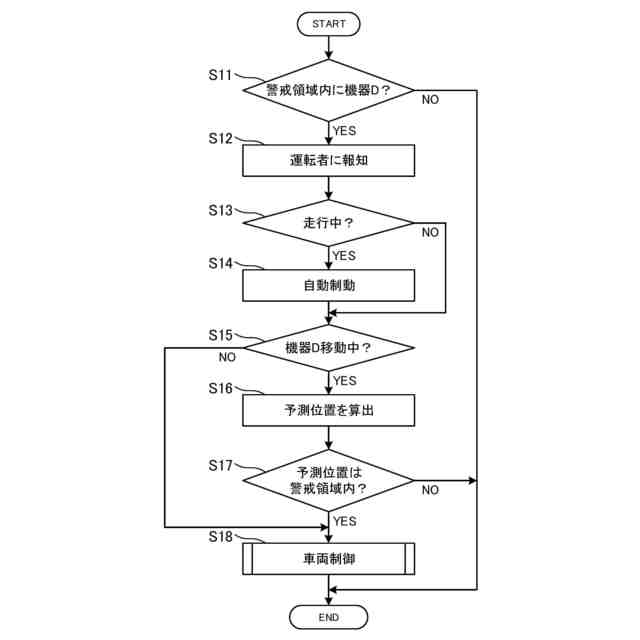 前記車両から所定距離未満の領域に進入した前記機器を検知すると共に、前記機器が移動している場合に、前記機器の所定時間後の位置を予測した予測位置を求め、