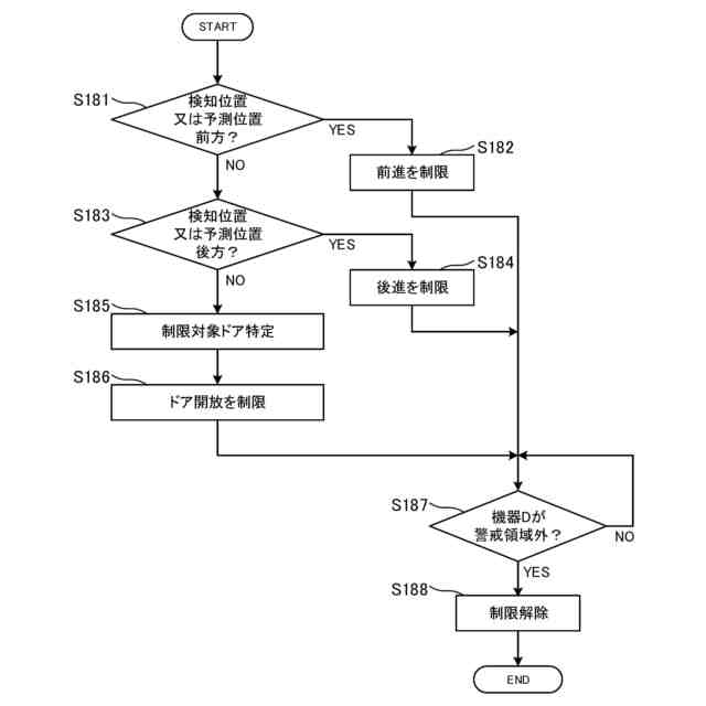 前記機器の検知位置又は前記予測位置が、前記領域において前記車両の前方に位置し、かつ、前記車両の進行方向が前方である場合に前記車両の前方への走行を制限し、