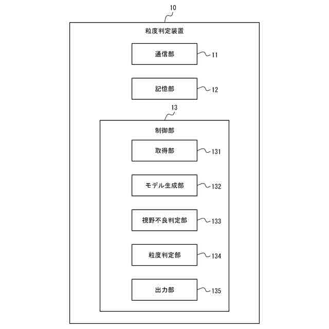 【解決手段】粒度判定装置(10)は、粒状物の粒度を判定する粒度判定装置であって、撮影装置によって撮影された粒状物の画像を取得する取得部(131)と、画像が視野不良か否かを判定する視野不良判定部(133)と、視野不良でないと判定された画像を用いて粒状物の粒度を判定する粒度判定部(134)と、を備える。
