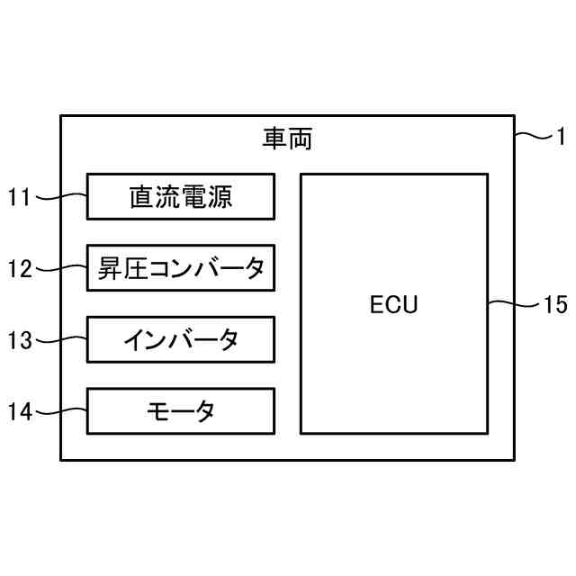 図1は、本発明の一実施形態である車両の構成を示すブロック図である。図1に示すように、本発明の一実施形態である車両1は、駆動装置として、直流電源11と、直流電源11の電圧を昇圧する昇圧コンバータ12と、昇圧コンバータ12によって昇圧された直流電源11の電圧を交流電圧に変換するインバータ13と、インバータ13によって変換された交流電圧を用いて車両1を駆動するモータ14と、モータ14のトルク指令と回転数に応じて昇圧コンバータ12を制御するECU15と、を備えている。