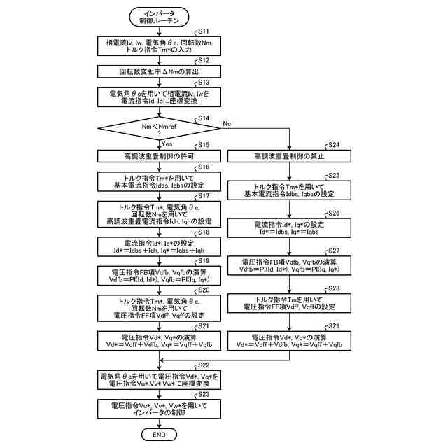 高調波重畳制御を実行するためには、PWM制御でキャリア周波数を高くする必要がある。このため、モータが高トルク状態や高回転状態となることによって電圧利用率が増加してPWM制御を実施できない場合、高調波重畳制御の実行を禁止する必要がある。しかしながら、モータの回転数が急増するシーンでは、モータの回転数の検出値と実際値との乖離によってモータの回転数が所定回転数を超えたとの判定が遅れ、高調波重畳制御の実行禁止が遅れる場合がある。このため、PWM制御を実施できるモータの回転数領域を確保することによって高調波重畳制御を実行可能な領域を確保可能な技術の提供が期待されていた。
