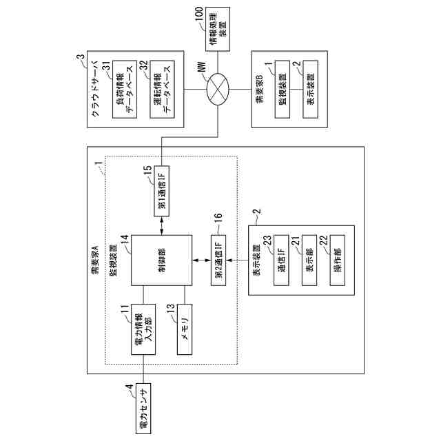 個々の負荷機器に対して計測装置を設けることなく、高圧受電設備から各負荷に供給する変圧器毎の電力を計測するだけで、稼働している負荷機器の稼働状況を推定できる電力監視システムが知られている(例えば、特許文献1参照)。この電力監視システムは、高圧受電設備の変圧器に流れる電流と電圧の情報を入手する電圧センサ、電流センサと、高圧受電設備から電力が供給される個々の負荷機器の動作電流及び力率の情報を含む負荷機器情報を記憶するクラウドサーバと、電圧センサ及び電流センサの計測情報とクラウドサーバの情報とを基に、稼働している負荷機器を推定すると共に、稼働している個々の負荷機器の使用電力を推定する監視装置と、推定結果を表示する表示装置とを有する。