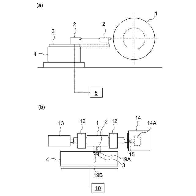 また、特許文献4には、測定精度の高い圧延ロールの表面欠陥検出技術が開示されている。その技術は、圧延ロールを軸回転させる回転機構と、圧延ロールの表面に検出部が対向しロール表面までの距離を測定する変位センサと、変位センサを支持し、ロールの軸方向に平行な方向である往復方向に移動可能な往復台とを備える装置である。その装置は、ロールの全周全幅の表面状態を測定可能で、ロール上の局所的かつ数ミリ程の3次元的な欠け落ちを検査することができる。