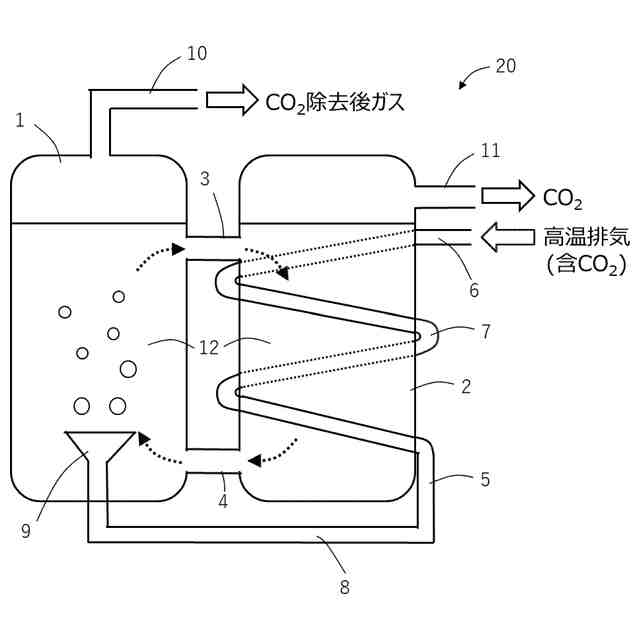 また、処理対象ガスから二酸化炭素を吸収して固体析出物として分離する処理液としては、イソホロンジアミンや水酸化カルシウム水溶液がある。これらの処理液を使用する場合には、二酸化炭素を固体析出物として分離し、この固体析出物をバッチ処理により加熱して分解し、二酸化炭素のガスを回収することが考えられる。