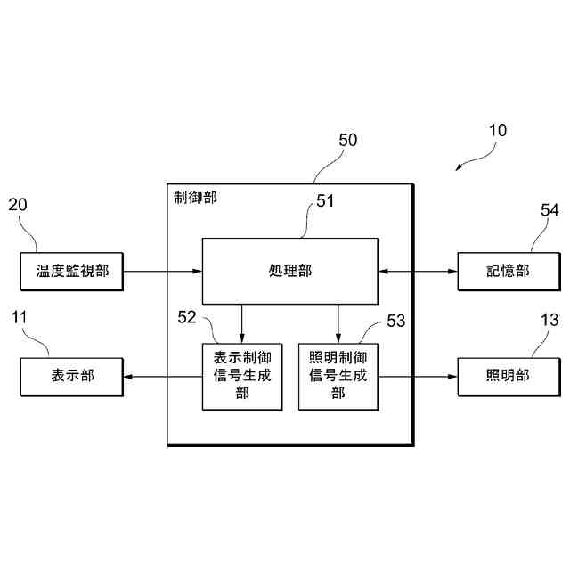 【解決手段】画像を表示する表示領域(17)を有する表示部(11)と、表示領域(17)のうちの画像を照射しない非照射領域に配置された温度監視部(20)と、温度監視部(20)から取得した温度に基づいて表示部(11)の温度を制御する制御部と、を備える。