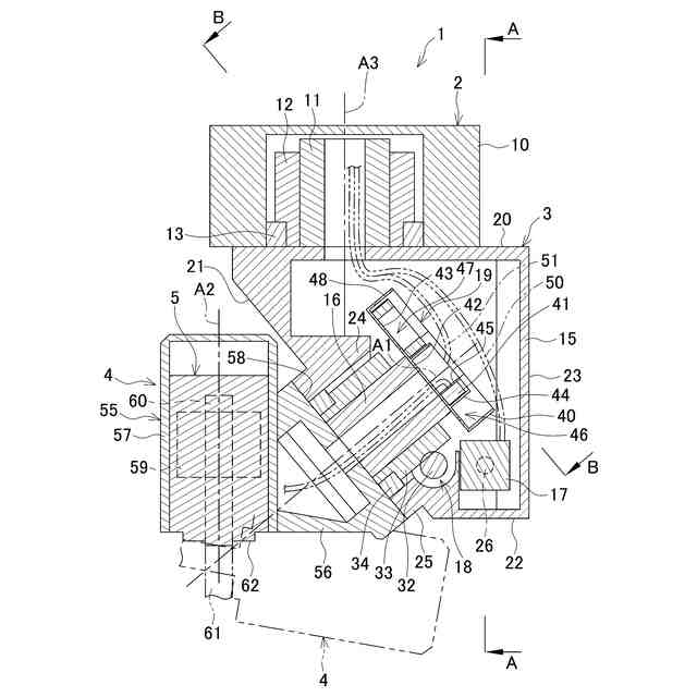 連結ユニット2は、連結ハウジング10を有している。連結ハウジング10は、サドルに取り付けられる筒状で、中空軸11及び従動ギヤ12と、従動ギヤ12を回転させるための図示しない駆動ギヤ及びモータとを収容している。中空軸11は、後述する本体ハウジング15の上面20から鉛直方向上向きに設けられている。中空軸11は、本開示の第2の旋回軸の一例である。従動ギヤ12は、中空軸11の外側へ一体に設けられている。従動ギヤ12は、連結ハウジング10内で軸受13を介して回転可能に支持され、連結ハウジング10内に設けた図示しない駆動ギヤと噛み合っている。