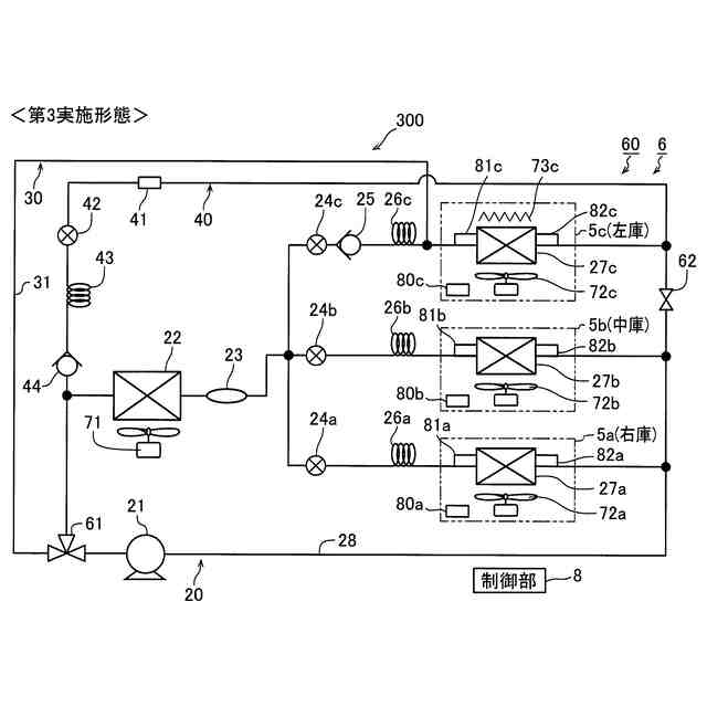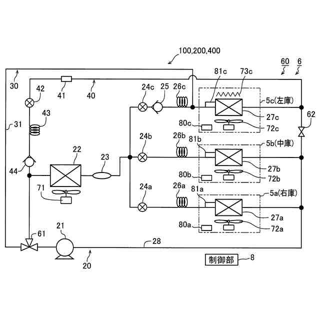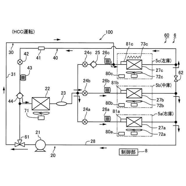 この場合、好ましくは、除霜時冷媒温度は、0℃よりも高くかつ収容庫内の目標温度よりも低い温度であり、制御部は、蒸発器の除霜時において、蒸発器に流入する冷媒の温度が除霜時冷媒温度となるように膨張弁の開度を調整することにより、蒸発器の除霜制御を行うように構成されている。このように構成すれば、0℃よりも高くかつ収容庫内の目標温度よりも低い除霜時冷媒温度の冷媒が蒸発器に流入されるため、蒸発器の除霜を効果的に行いつつ、蒸発器での冷媒の蒸発により収容庫内の空気を冷却することによって収容庫内の温度が目標温度よりも高くなることを適切に抑制することができる。そのため、蒸発器の除霜時において、蒸発器の除霜を効果的に行いながら、商品が収容される収容庫内の温度が過度に上昇するのを適切に抑制することができる。