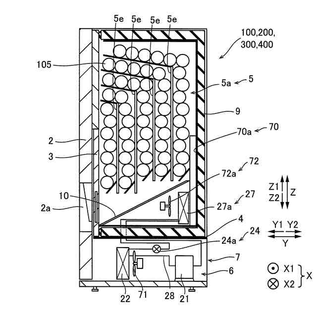 【解決手段】この自動販売機100は、商品105が収容される収容庫5と、冷媒を圧縮する圧縮機21と、圧縮機21から吐出された冷媒を凝縮する凝縮器22と、凝縮器22により凝縮された冷媒を膨張させる膨張弁24a~24cと、膨張弁24a~24cによって膨張された冷媒を蒸発させる蒸発器27a~27cと、蒸発器27a~27cの除霜時において、膨張弁24a~24cによって膨張された冷媒を蒸発器27a~27cに流入させるとともに、蒸発器27a~27cに流入する冷媒の温度が収容庫5内の冷却時の温度よりも高い除霜時冷媒温度となるように膨張弁24a~24cの開度を調整することにより、蒸発器27a~27cの除霜制御を行う制御部8と、を備える。