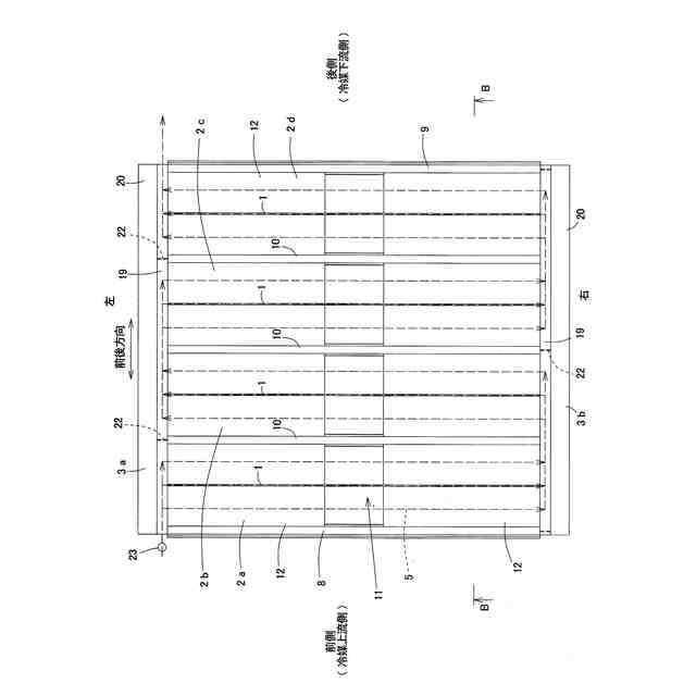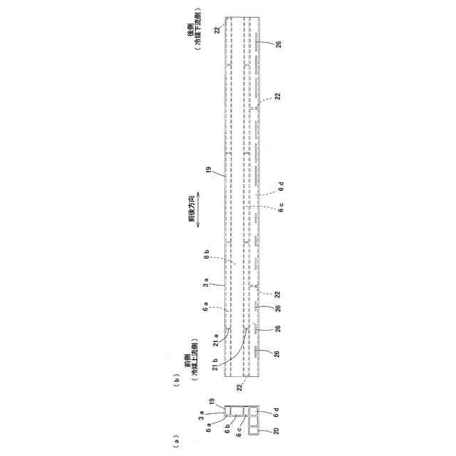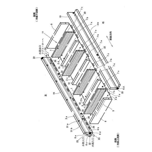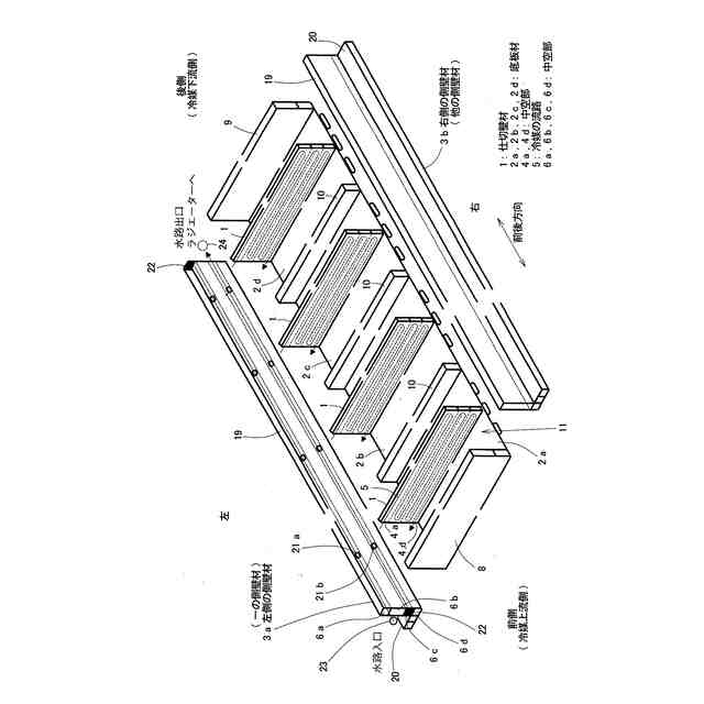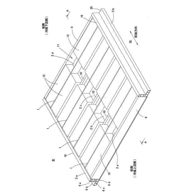 【解決手段】 複数の仕切壁材1,1,…と底板材2a,2b,2c,2dと一と他の側壁材3a,3bとを備え、仕切壁材1,1,…は、複数の中空部4a,4b,4c,4d,4eが上下に並べて設けてあり、長手方向の両端面を一と他の側壁材3a,3bに突き当ててあり、冷媒が上下方向にジグザグ状に流れるように冷媒の流路5が形成してあり、一の側壁材3aは、上部と下部に冷媒が流れる中空部6a,6cを有し、上部の中空部6aが仕切壁材1の上の中空部4aと連通し、下部の中空部6cが仕切壁材の下の中空部4dと連通している。