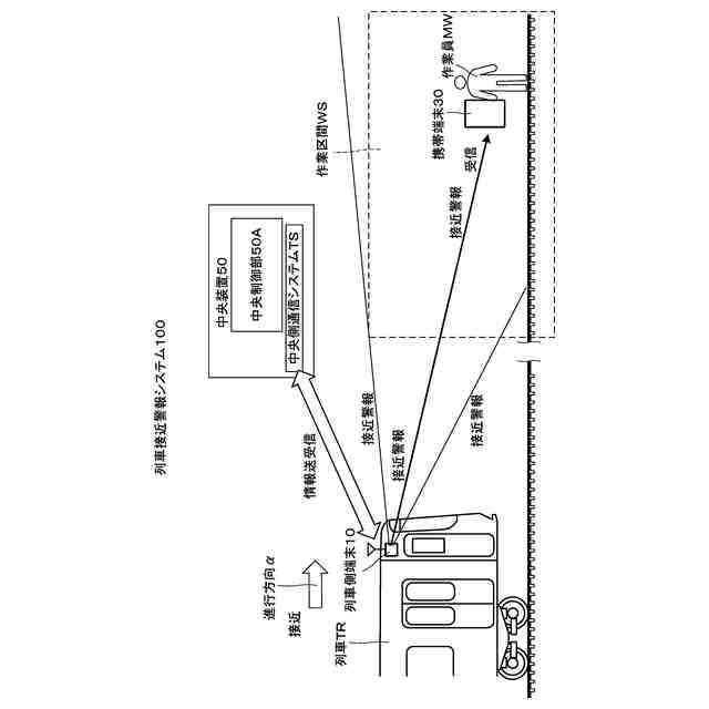 【解決手段】 列車接近警報システム100は、列車TRに搭載され、作業区間WSへの接近を示す接近警報を発する列車側端末10と、作業区間WSに存在する作業員MWに所持され、列車側端末10からの接近警報を受信する携帯端末30とを備える。上記列車接近警報システム100では、列車側端末10から発せられた作業区間WSへの接近を示す接近警報を、作業区間WSに存在する作業員MWが所持する携帯端末30で受信する態様とすることで、簡易な構成で確実に列車の接近を、作業員MWへ伝達できる。