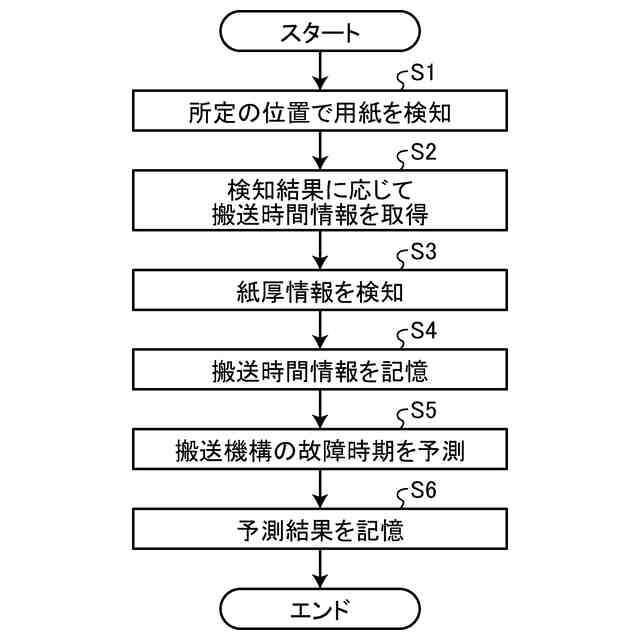【解決手段】搬送機構によって搬送された用紙を搬送経路上の所定の位置において検知する用紙検知部と、前記搬送経路上の所定区間において前記用紙を搬送するために要した搬送時間を示す搬送時間情報を前記用紙検知部による検知結果に応じて取得する搬送時間情報取得部と、前記用紙の厚さを示す紙厚情報を検知する紙厚検知部と、前記用紙の厚さ毎に搬送時間情報を記憶する検知情報記憶部と、前記搬送機構の故障時期を予測する予測部と、を備える。