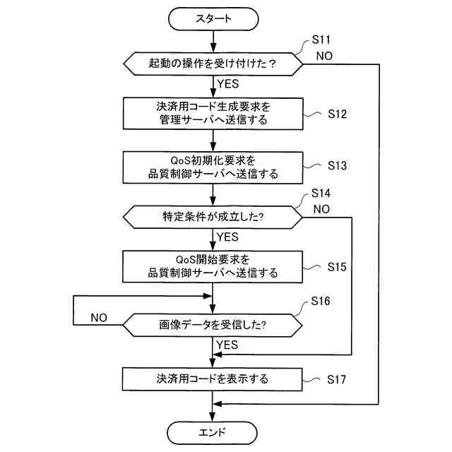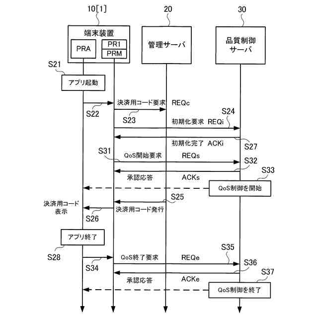 【解決手段】処理装置11は、送信部112と、受信部113とを備える。送信部112は、アプリケーションプログラムPRAの起動処理が開始された後において特定条件が成立した場合、QoS開始要求REQsを、品質制御サーバ30へ送信する。受信部113は、QoS制御に関する制御信号を品質制御サーバ30から受信する。特定条件は、第1時点までに、受信部113がアプリケーションプログラムPRAに対応する管理サーバ20から決済用コードに関するデータを受信していないことである。第1時点は、受信部113が品質制御サーバ30から初期化完了信号ACKiを受信する時点である。