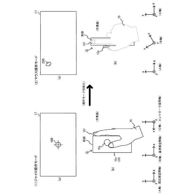 【解決手段】第1条件を満たしたことに基づいて、入力装置のマウスセンサデータに基づいて第1オブジェクトを操作する第1操作モードから、入力装置のジャイロセンサデータに基づいて第2オブジェクトを操作する第2操作モードに移行させ、重力方向に垂直な方向の向きのジャイロ補正を実行する。