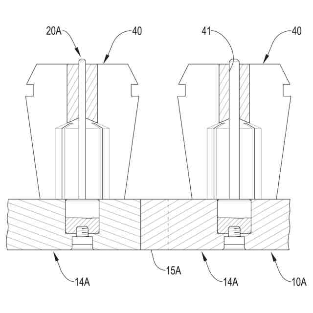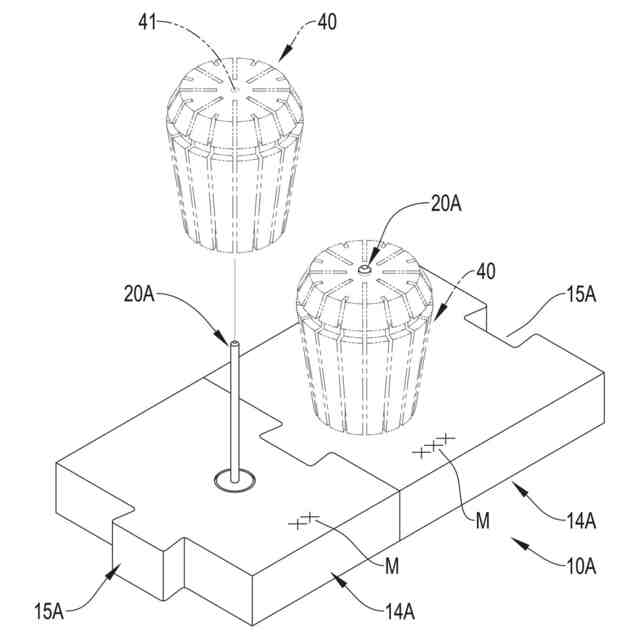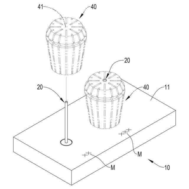 前記本体10は、載置面11を有し、前記載置面11は、前記本体10の上面に設けられ、コレット40を配置することに使用される。本発明の第1好適実施形態では、前記本体10は、板体である。前記少なくとも2つの外嵌部材20は、前記本体10の載置面11上に間隔をあけて設置され、前記載置面11から延伸し、各前記外嵌部材20は、コレット40のツールクランプ穴41を外嵌させることに使用され、且つ前記少なくとも2つの外嵌部材20は、異なる外径を有し、異なる内径のツールクランプ穴41を有するコレット40を外嵌させる。さらに、前記本体10は、前記載置面11における各前記外嵌部材20に対応する位置に各前記外嵌部材20に対応する寸法記号Mが設置され、ユーザに外径寸法の異なる各前記外嵌部材20を介してツールクランプ穴41の寸法に対応するコレット40を収納させることができ、また、載置面11に標記された寸法記号Mを介して確認させ、コレット40を正確に収納させることができる。