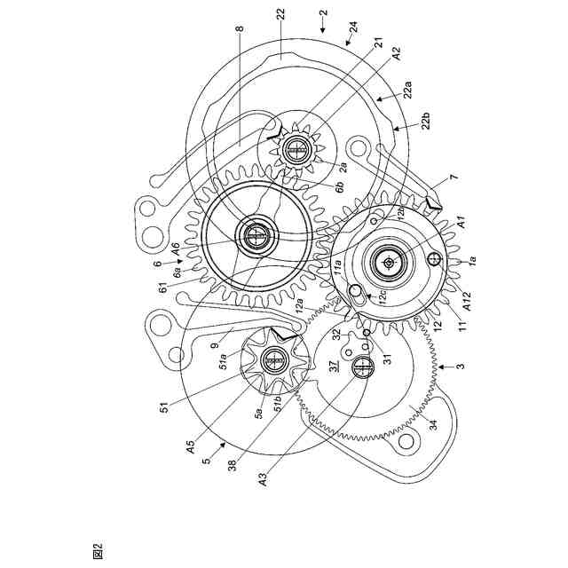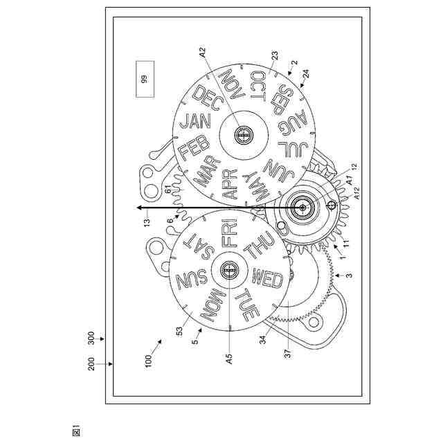 前記日付可動部(1)は、第一軸(A1)周りに旋回し、前記月可動部(2)は、第二軸(A2)周りに旋回し、前記駆動可動部(3)は、第三軸(A3)周りに旋回し、前記第一軸(A1)、前記第二軸(A2)及び前記第三軸(A3)は別個である、