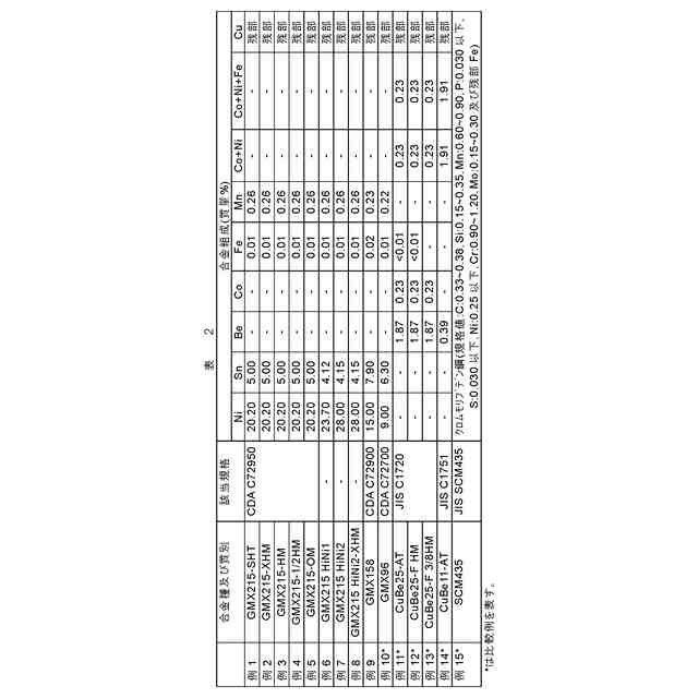ところで、ベリリウム銅合金に比肩する強度を有する合金としてニッケルスズ銅合金が知られている。特許文献4(特許第6492057号公報)には、5~20質量%のNi、5~10質量%のSn、不純物、微量添加物及び残部銅からなるスピノーダル合金であって、少なくとも517MPa(75ksi)の0.2%オフセット耐力及び少なくとも16J(12フィートポンド)の衝撃靭性を有するものが開示されている。特許文献5(特許第6651464号公報)には、9~15.5重量%のNiと、6~9重量%のSnとを含み、残部が銅であるスピノーダル硬化銅-ニッケル-錫合金を含む、サッカーロッドのためのカップリングが開示されており、この合金は、少なくとも95ksiの0.2%オフセット降伏強さと、室温において少なくとも22フィートポンドのシャルピーV切り欠き衝撃エネルギーとを有するとされている。特許文献4及び5は耐水素特性に関する検討は何らなされていない。
