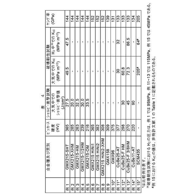 したがって、耐水素特性を呈しかつクロムモリブデン鋼より優れた強度を有するベリリウム銅合金を水素下で作動する部品として使用することは、高速運転や間歇運転など作動条件を拡充する上で有利といえる。しかし、部品への負荷時の撓みや高速回転時の径方向の膨張などに影響する材料のヤング率は、クロムモリブデン鋼が200GPaであるのに対し、ベリリウム銅合金は127GPaとやや低めである。このため、特に水素雰囲気下での部品の回転数向上のために、(水素雰囲気下での高強度、高破壊靭性値等の)耐水素脆性を呈し、かつ、少しでも高いヤング率を有する材料が求められていた。