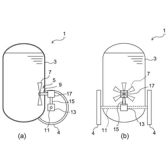 (2)また、上記(1)に記載のものにおいて、前記撹拌装置は、前記貯蔵タンク内に配置された撹拌部材と、一方が該撹拌部材に連結されて他方が前記貯蔵タンクの外部に配置され、前記撹拌部材に撹拌動作を伝達する撹拌動作伝達部材と、を備え、