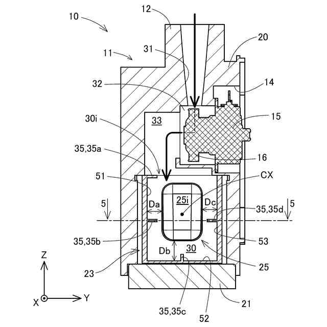 前記バッファ室の内壁面は、前記バッファ室を前記中心軸方向に見たときに、前記計測流路部の入口を挟んで、前記上流側流路部が接続された前記バッファ室の入口に対向する位置にある奥方壁面を含み、