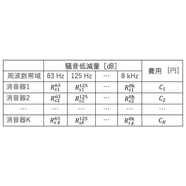 しかし、設備は、その種類によって、発生する騒音の周波数特性が異なる。同様に、消音器においても、その種類によって、消音する対象となる音の周波数特性が異なる。このため、設備に対して消音器を設置するに際しては、その種類を、詳細に検討する必要がある。ここで、対策を要する設備や、敷地境界上において騒音を評価するべき地点の数は、通常であれば、数十、数百の数に及ぶ。このため、敷地境界線上の全ての地点において騒音が規制値以下となるように、消音器の設置費用を考慮しつつ、各設備に対して適切に消音器の種類を選定する、という作業を、人間が行うことは、実質的に不可能である。
