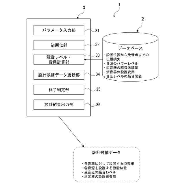 建物施設内の音源を設置する対象となる複数の設置位置の各々から受音点の各々までの、周波数帯域ごとの伝搬損失、複数の種類の消音器の各々の、周波数帯域ごとの騒音低減量及び設置費用、前記音源の各々の、周波数帯域ごとのパワーレベル、及び前記受音点の各々における音圧レベルの騒音閾値が、設計条件として設定されているデータベースと、