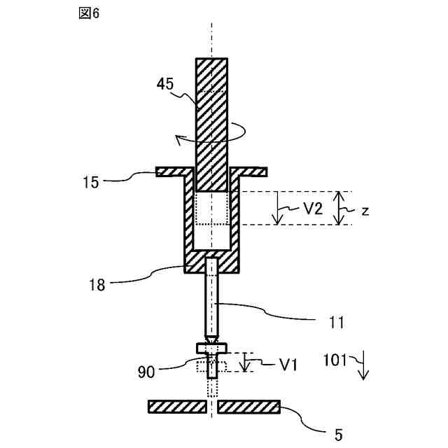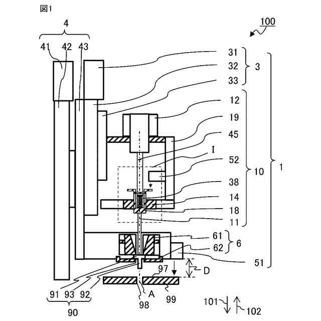 図1に示すように、ねじ締め装置100は、ねじ締めユニット1と、ユニット位置変位部4とを主に有している。ねじ締めユニット1は、ねじ90を回転させつつ、ねじ90を移動させる。ユニット位置変位部4は、ねじ締めユニット1を移動させる。ねじ締め装置100は、ねじ90を被締結物99に締結する。被締結物99の主面97において、雌ねじ98が設けられている。ねじ90は、頭部91と、雄ねじ部92とを有している。雄ねじ部92は、頭部91に連なっている。頭部91は、座面93を構成している。座面93は、主面97に接触する面である。