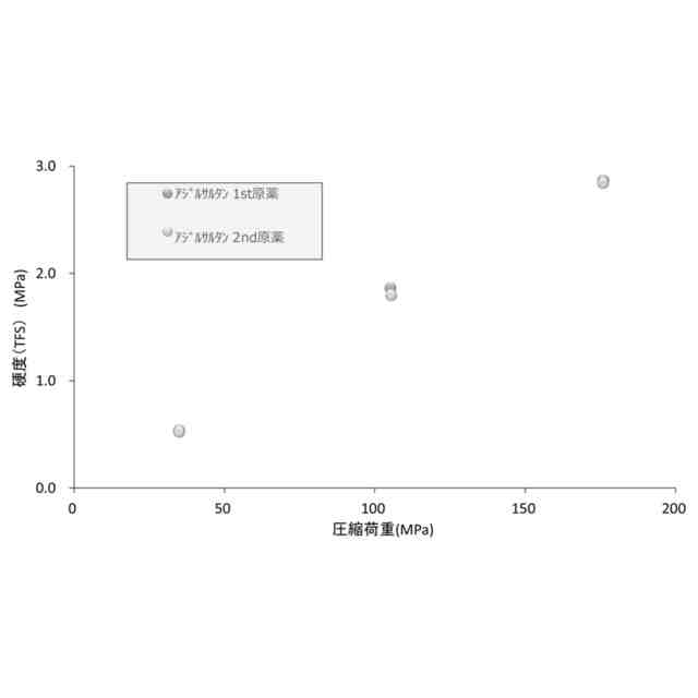 前記原薬に、圧縮荷重を0~200MPaの範囲で負荷して圧縮成形した圧縮成形物の硬度を測定し、