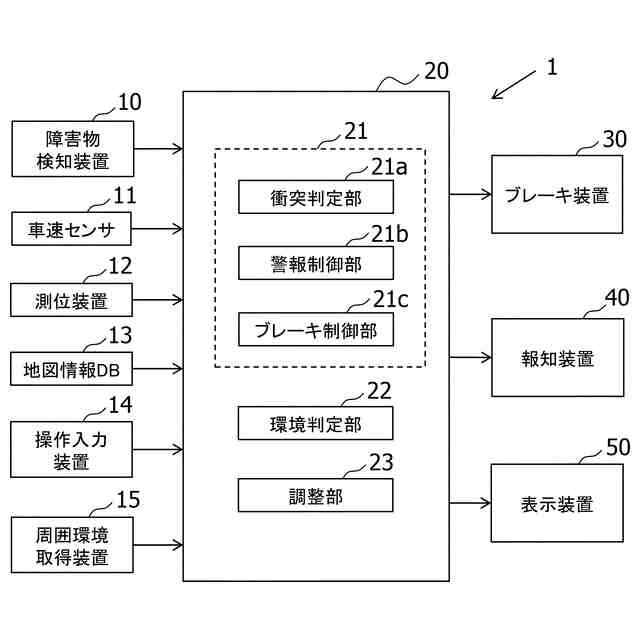 図1に示すように、車両の制御システム1は、例えば、車両周囲の障害物を検知する障害物検知装置10、車両の車速を検知する車速センサ11、車両の位置情報を取得する測位装置12、地図情報データベース13、操作入力装置14、車両の衝突被害軽減ブレーキ制御に関連する制御を行う制御装置20、ブレーキ装置30、および報知装置40を備えている。本実施の形態による車両の制御システム1は、車両に搭載されて車両の衝突被害軽減ブレーキ制御に関連する制御を実行するように構成されている。車両の制御システム1は、任意選択的に、車両周囲の環境情報を取得する周囲環境取得装置15、および表示装置50をさらに備えることもできる。